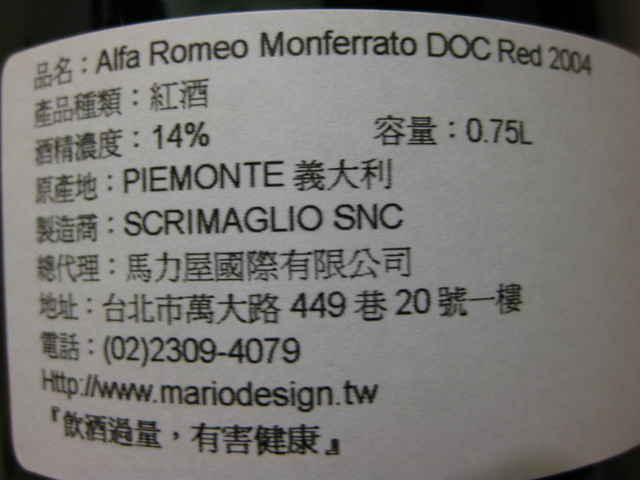 今天馬兒帶了一支比較少見的 Alfa Romeo Monferrato DOC Red 2004